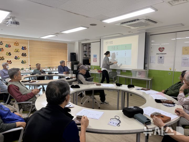 이날 오전에는 악기 ‘칼림바’를 활용한 음악 교실도 진행됐다. 어르신들은 둥근 테이블에 둘러앉아 각자의 손에 하나씩 칼림바를 들었다. 돋보기 너머로 악기를 바라보는 눈빛에는 열정이 가득했다.