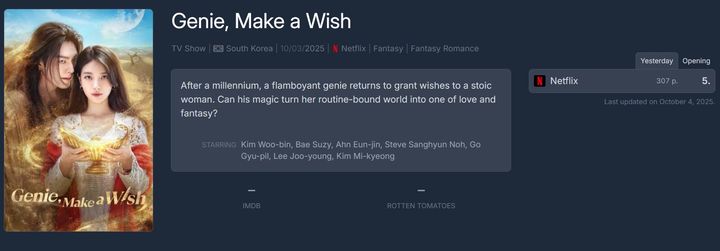 5일 글로벌 스트리밍 서비스 시청 순위 집계 사이트 ‘플릭스패트롤’에 따르면, 지난 3일 공개된 ‘다 이루어질지니’는 넷플릭스 TV쇼 부문 5위를 기록했다.