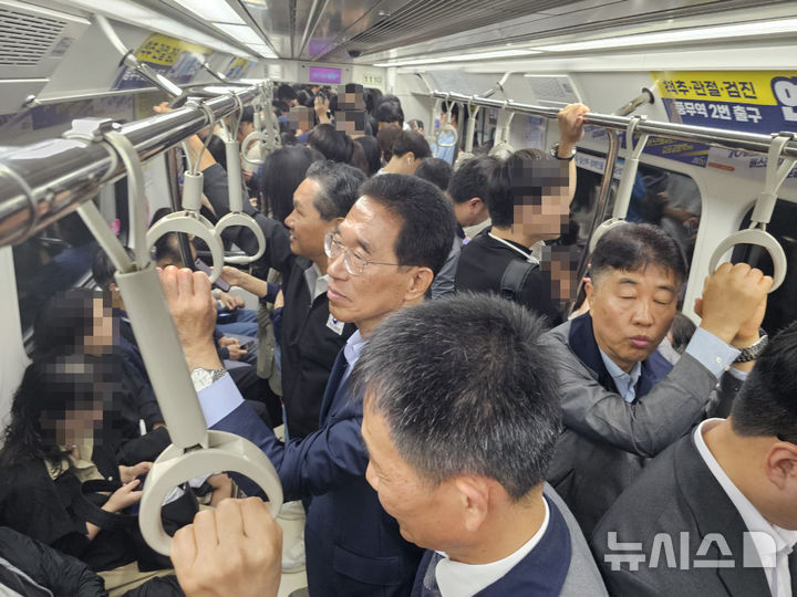 [김포=뉴시스] 정일형 기자 = 더불어민주당 김주영 국회의원(경기 김포갑·환경노동위원회 간사)이 24일 오전 김용석 국토부 대도시광역교통권위원회 위원장과 함께 출근길 김포골드라인을 직접 탑승해 교통 혼잡 실태를 점검하고, 근본적 해결책인 서울 5호선 김포 연장의 조속한 확정을 강력히 촉구했다.