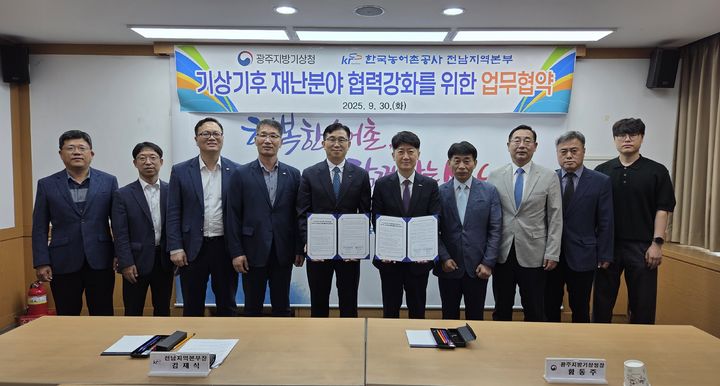 [광주=뉴시스]이현행 기자 = 광주지방기상청은 30일 한국농어촌공사 전남지역본부와 기상재해 예방과 농어촌 녹색성장을 지원하기 위한 업무협약을 체결했다고 밝혔다.