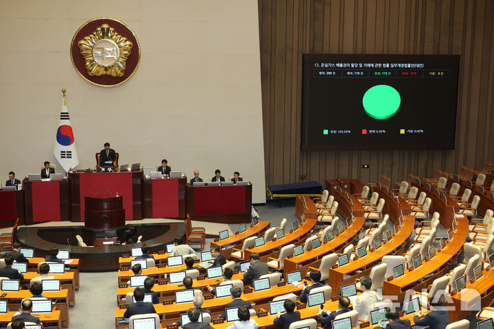 ◎공감언론 뉴시스 jikime@newsis.com [서울=뉴시스] 김지훈 기자 = 국민의힘은 29일 더불어민주당의 온실가스배출권 할당 및 거래에 관한 법률 일방 처리에 “강력 규탄한다”고 했다.최수진 원내수석대변인은 법안 처리 직후 공지를 통해 “금일 본회의에서 처리된 ‘온실가스배출권 할당 및 거래에 관한 법률’ 일부개정법률안은 교섭단체 간 합의는커녕 전혀 논의된 바 없는 법안”이라며 이같이 밝혔다. 최 원내수석대변인은 “더불어민주당 원내지도부 뜻대로 일방적으로 의사일정을 변경한 것”이라며 “여야 간에 전혀 협의되지 않은 법안을 일방적으로 상정해 여당 단독처리로 통과시킨 것을 강력 규탄한다”고 했다. 이 법안은 이날 국회 증언·감정 등에 관한 법률 개정안이 필리버스터(무제한 토론) 종료 후 국회 본회의를 통과한 직후 상정돼 처리됐다. 이 법안이 본회의 상정되기에 앞서 여야 간에 이와 관련한 협의는 없었다는 게 국민의힘의 주장이다.
