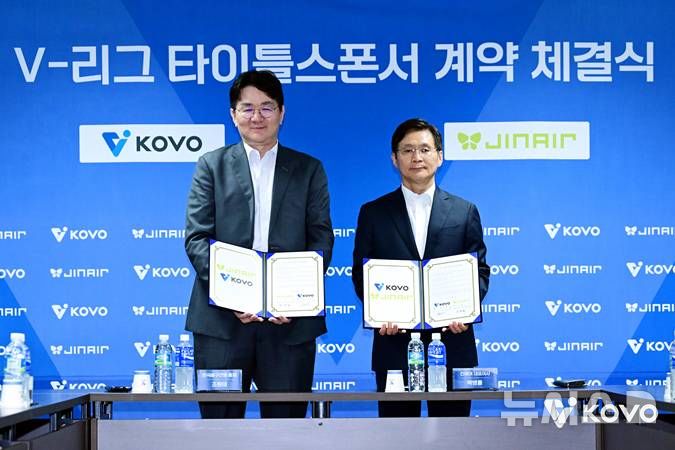 ◎공감언론 뉴시스 knan90@newsis.com [서울=뉴시스]안경남 기자 = 한국배구연맹(KOVO·총재 조원태)이 V-리그의 새 타이틀 스폰서로 국내 저비용항공사 진에어(대표 박병률)와 손잡았다.배구연맹은 30일 서울 마포구 상암동 연맹 대회의실에서 진에어와 V-리그 타이틀 스폰서 협약식을 가졌다.이날 협약식에는 조원태 KOVO 총재와 박병률 진에어 대표이사가 참석했다.계약기간은 ‘1+1’로, 2025~2026시즌부터 2026~2027시즌까지 최대 2시즌 동안 동행한다.진에어는 조원태 총재가 수장을 맡은 한진그룹의 계열사로 2008년 1월 설립됐고, 아시아를 대표하는 실용 항공사로 꼽힌다.연맹은 대한민국 프로배구의 지속적인 발전과 한국 배구의 국제 경쟁력 강화, V-리그의 관중 증대 등 진에어와 함께 다양한 마케팅 활동을 펼칠 계획이다.진에어 관계자는 “전 국민의 사랑을 받는 배구를 통해 많은 분과 더 가까이 소통해 더욱 사랑받는 항공사로 발전해 가겠다”라고 전했다.KOVO는 “진에어와 함께 손을 잡게 되어 기쁜 마음이다. 아시아를 대표하는 항공사와 함께 V-리그는 물론 한국배구의 발전을 위해 최선의 노력을 기울일 예정”이라고 화답했다.