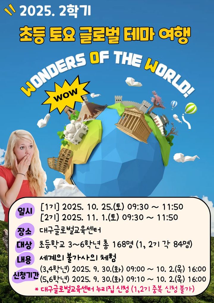 [대구=뉴시스] 박준 기자 = 대구글로벌교육센터는 내달 25일과 11월1일 초등학교 3~6학년 학생을 대상으로 2학기 초등 글로벌 테마 여행 프로그램을 운영한다.