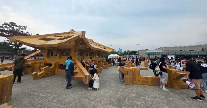 ◎공감언론 뉴시스 caleb@newsis.com [수원=뉴시스] 이준구 기자 = 올해로 62년을 맞은 수원화성문화제에 시민의 손으로 세운 ‘팔달문’이 화제가 되고 있다.문화제 행사는 한양에서 아버지 사도세자가 묻힌 화산능을 참배하러 가는 정조대왕의 능행차의 행렬도 장관을 이루지만 올해는 수원화성의 역사와 건축을 주제로 한 프로그램의 하나로 시민과 건축사들이 함께 만든 명물 ‘팔달문’이 화성행궁에 등장했다.팔달문은 수원화성의 남문으로 보물 제402호로 1796년(정조 20년)에 완공됐는데 국보 1호인 숭례문과 비슷한 건축물로서 규모는 더 크다. ‘시민의 건축 팔달’ 프로젝트는 지난달 19일부터 모집한 시민들이 프랑스 공공예술가 올리비에 그로스떼뜨의 주도 아래 수원지역건축사회도 동참해 만들었다.종이박스를 자르고 조립하며 제작한 팔달문은 가로와 세로가 각각 18.68m, 13.87m에 높이는 11.73m로 실제 크기의 60% 규모다.행궁광장에 들어선 팔달문은 단순한 볼거리를 넘어, 시민이 직접 참여하고 도시의 정체성을 재발견하는 장으로 자리매김했다. 특히 시민과 건축사들은 수원화성 축성에 참여했던 조상들의 노고를 떠올리며 직접 수원의 문화유산을 체험하는 특별한 경험을 했다.이들이 세운 팔달문은 3일까지 전시되며, 4일 오후 3시 완성된 종이 팔달문을 허무는 퍼포먼스로 시민들이 함께 축제를 마무리할 예정이다.올리비에 그로스떼뜨(Olivier Grosstête)는 “시민들이 손수 팔달문을 세워 올리는 과정은 단순한 조형 행위가 아니라 공동체가 함께 만든 상징적 건축”이라며 “마지막 순간까지 시민들이 참여의 기쁨을 함께 나누기 바란다”고 말했다.실무를 맡은 수원지역건축사회 서정일 부회장은 “수원의 대표 축제에 색다른 프로젝트를 선보이게 돼 보람 있었다”며 “팔달문의 건축적 맥락과 시대적 의미를 시민들에게 전하기 위해 별도의 해설 프로그램도 마련했다”고 밝혔다.