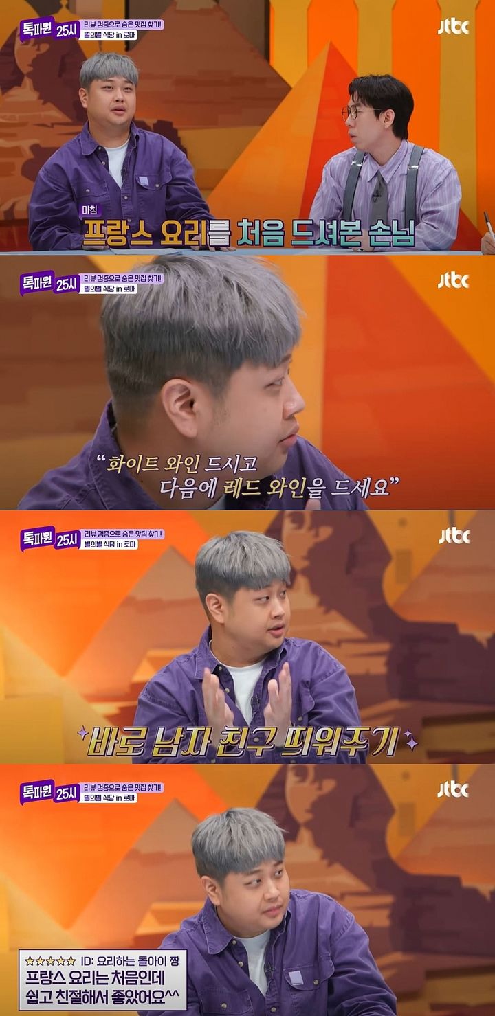 ◎공감언론 뉴시스 sja29@newsis.com [서울=뉴시스]신지아 인턴 기자 = 윤남노 셰프가 레스토랑 운영 중 기억에 남는 좋은 리뷰가 있었다고 말했다.그는 지난 29일 방송한 JTBC 예능 프로그램 ‘톡파원 25시’에 게스트로 출연했다.윤남노는 “레스토랑에서 음식 설명을 간단하게 하는 편”이라며 “길게 얘기하면 내 자랑만 하는 것 같다”고 했다.그는 “‘부야베스’라는 콘셉트 요리가 있는데 (손님이) 프랑스 요리를 처음 드셔봤다더라. 처음 오면 안 먹어본 음식이라 기가 죽을 수도 있다”고 말했다.윤남노는 “(커플 손님이었는데) 남자친구가 여자친구 앞에서 작아보이는 게 싫을 수 있으니 간단하게 ‘프랑스식 해물탕이다’라고 설명했다”고 했다.이어 그는 “남자친구한테 귓속말로 화이트 와인 드신 다음에 레드 와인 드시라고 했다”라며 “손님이 말씀하시자마자 제가 지금이 딱 마실 타이밍이라며 치고 들어갔다”고 말했다.윤남노는 “(두 번째) 와인은 서비스로 드렸다. 남자끼리 윙크도 했다”고 덧붙였다.그는 “‘프랑스 요리는 처음인데 쉽게 설명해주셔서 좋았다’는 리뷰를 봤는데 그 손님 얼굴이 딱 생각나더라”라고 말했다.