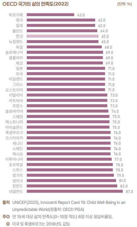 만 15세 청소년의 삶의 만족도는 65%(2022년 기준)로 OECD 국가 중 하위권(30위)을 차지했다. 2020년(67%)때보다도 2%p 낮아진 것이다.