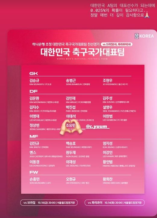 명단에는 손흥민을 비롯해 김민재, 이강인, 황희찬 등과 함께 조유민의 이름이 포함됐다.